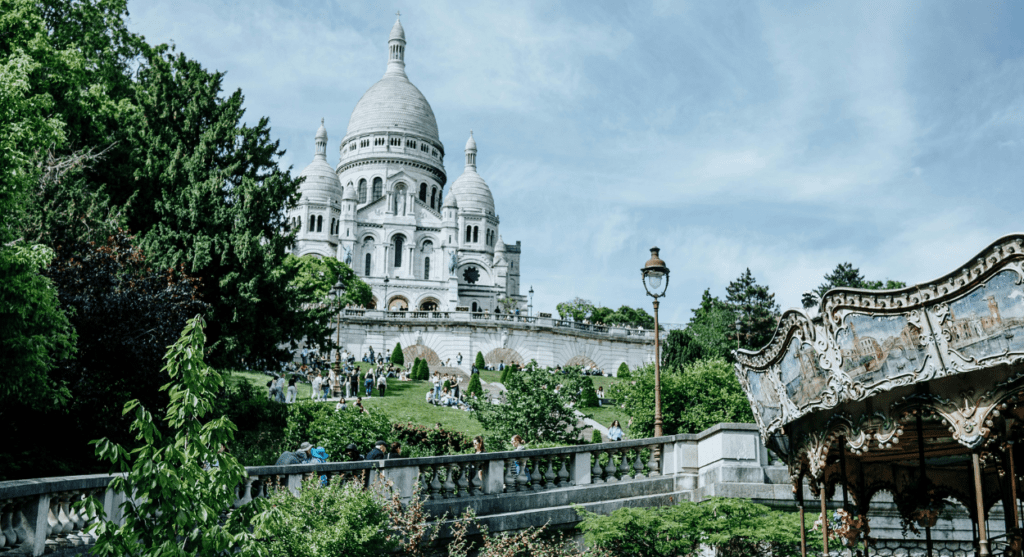 Finalize o passeio subindo até a imponente Basílica de Sacré-Cœur, localizada no ponto mais alto de Paris. Além da arquitetura branca marcante, o grande destaque é a vista panorâmica da cidade. Dali, você consegue enxergar vários monumentos espalhados pelo horizonte.