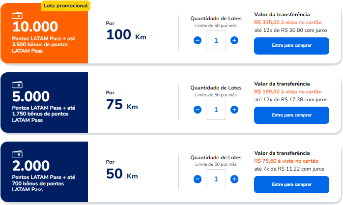 Para participar, envie seus KM de Vantagens pelo site da promoção (clique aqui) até o dia 17/01/24. Lembrando que o envio de pontos não é gratuito, mas com a promoção é uma oportunidade de gerar pontos LATAM Pass por até R$24,81. Confira os valores dos lotes abaixo: